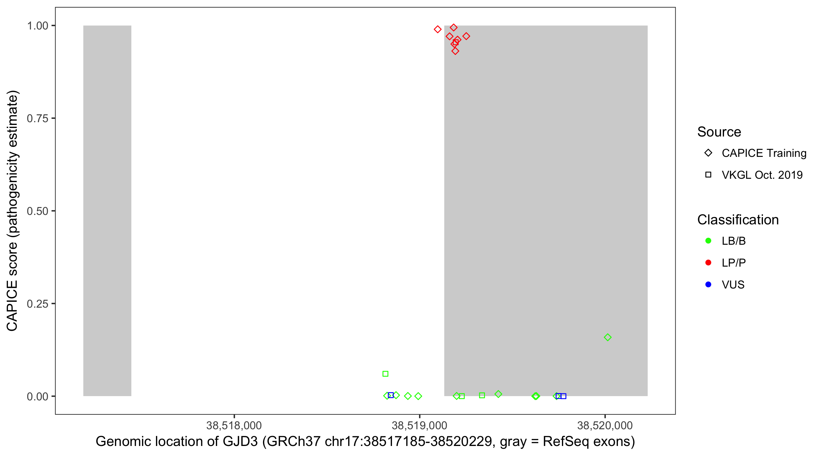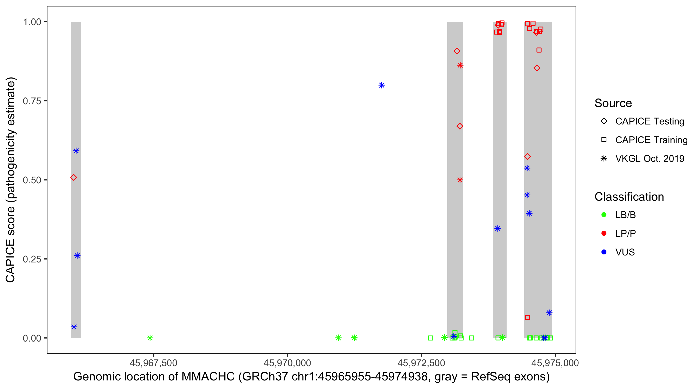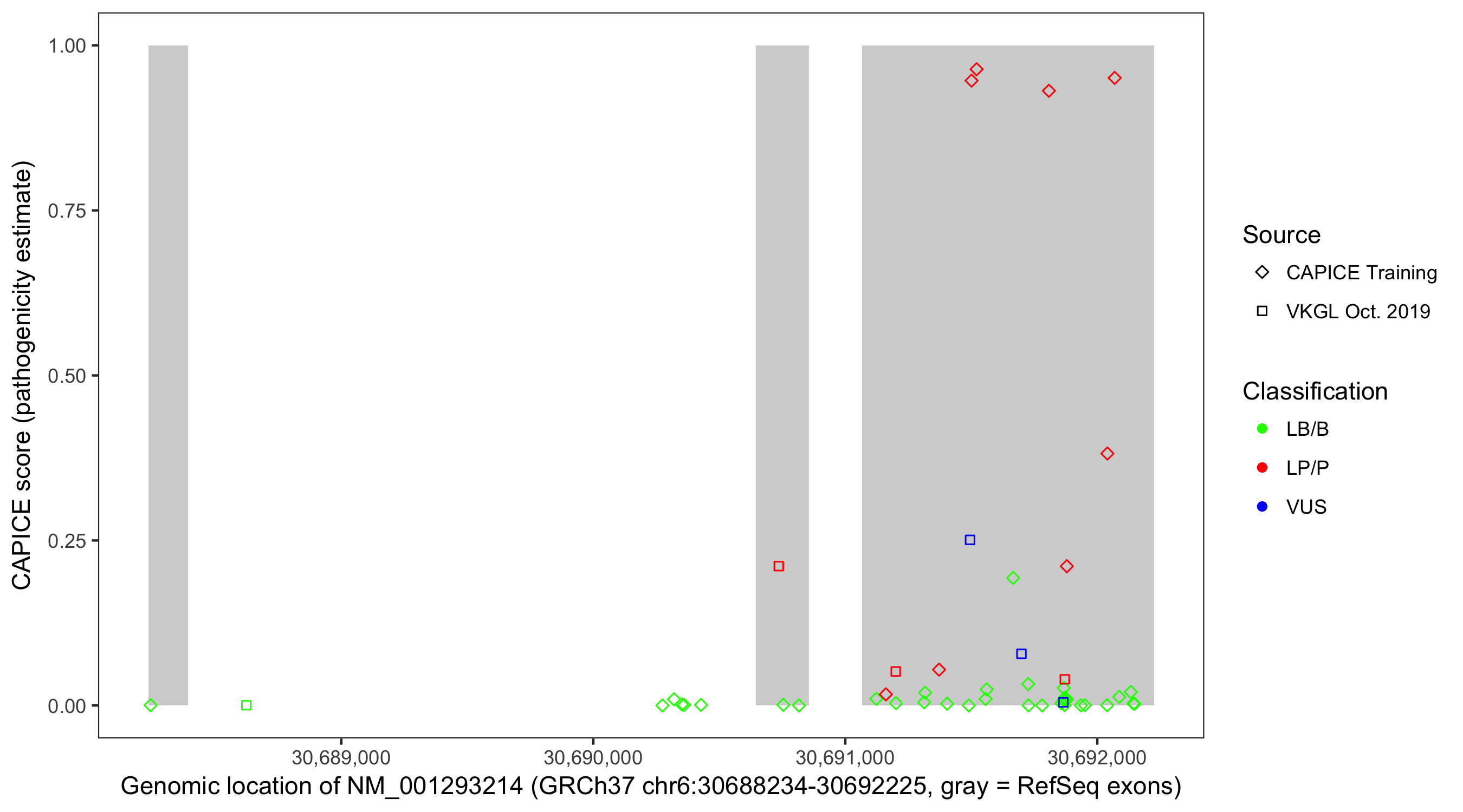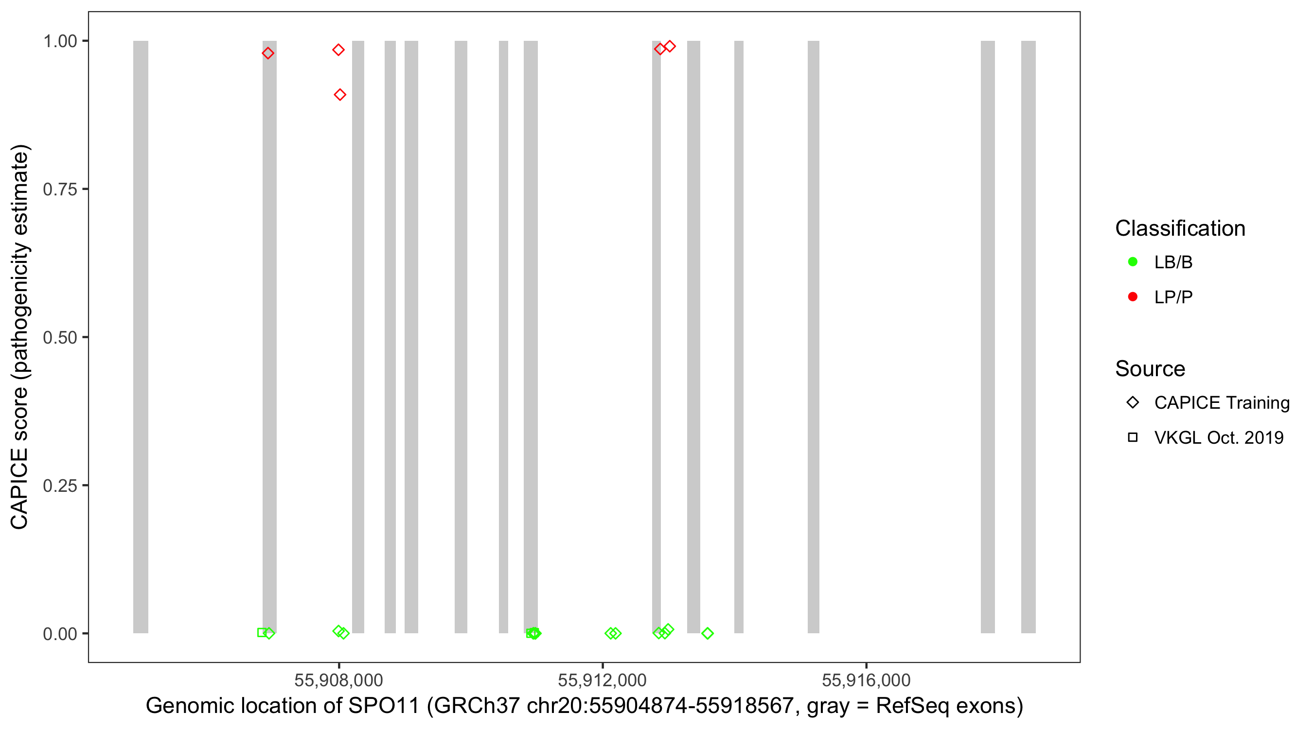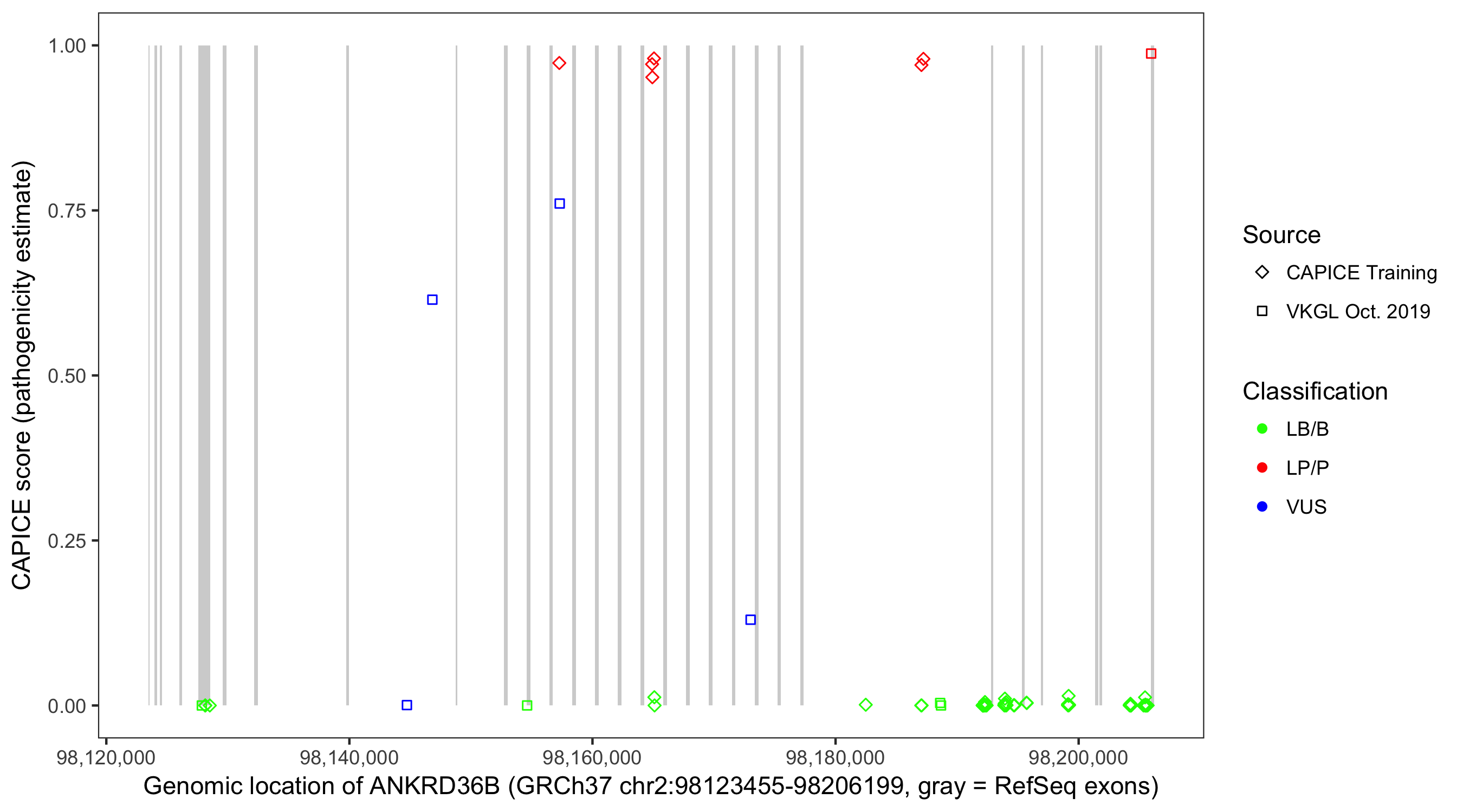 Shown are CAPICE train/test variants plus VKGL Oct 2019.