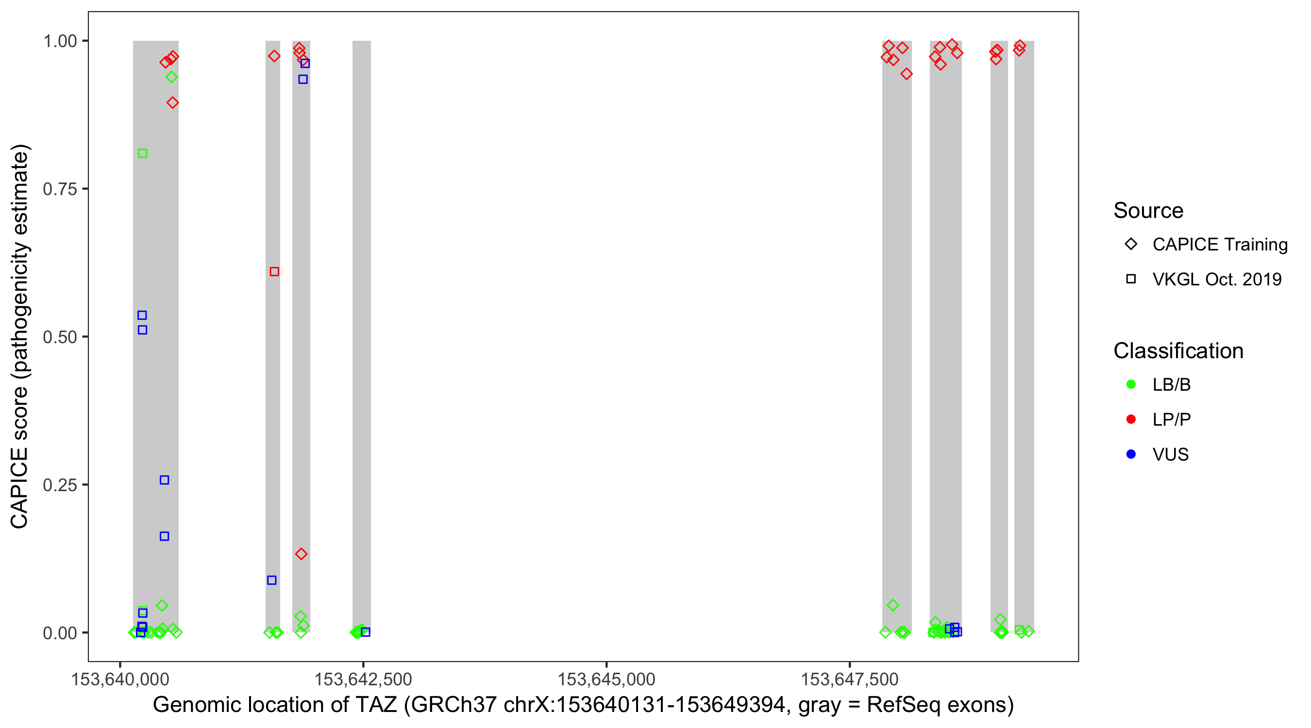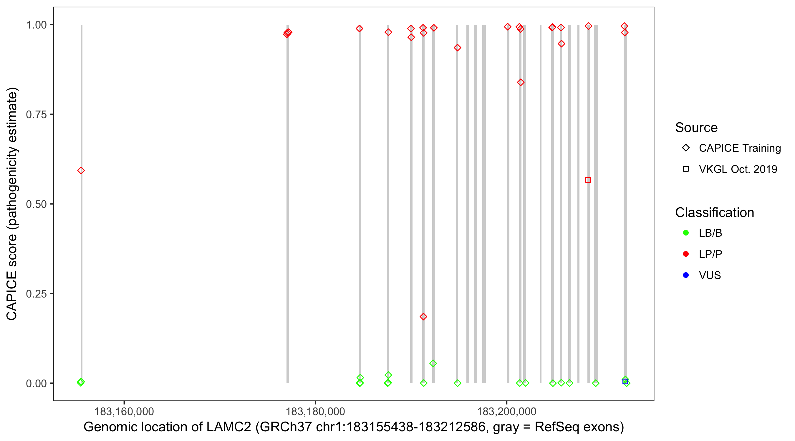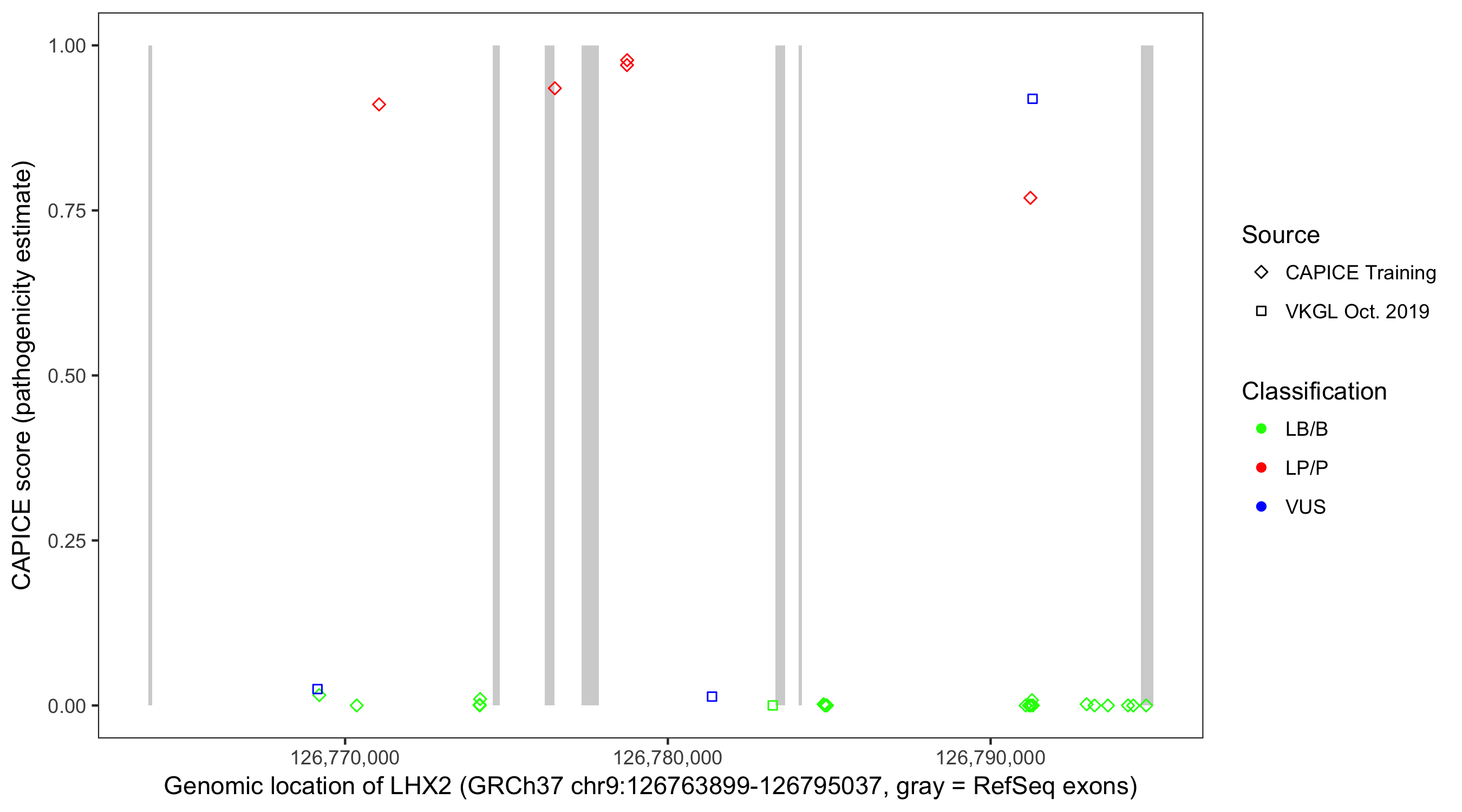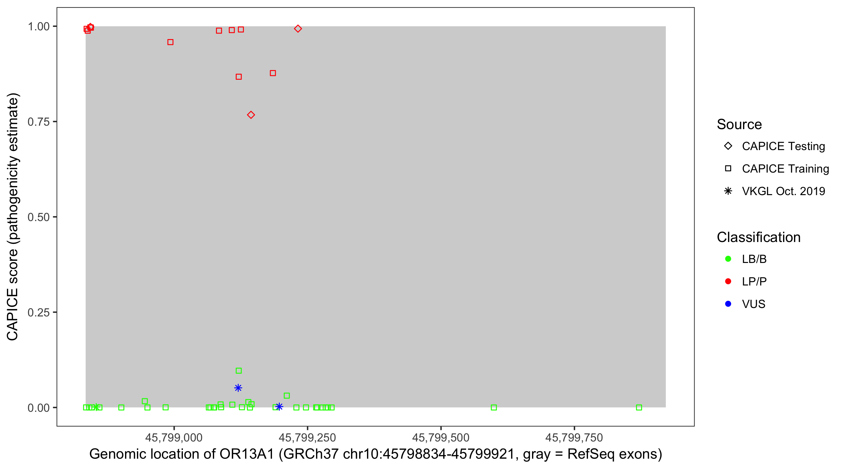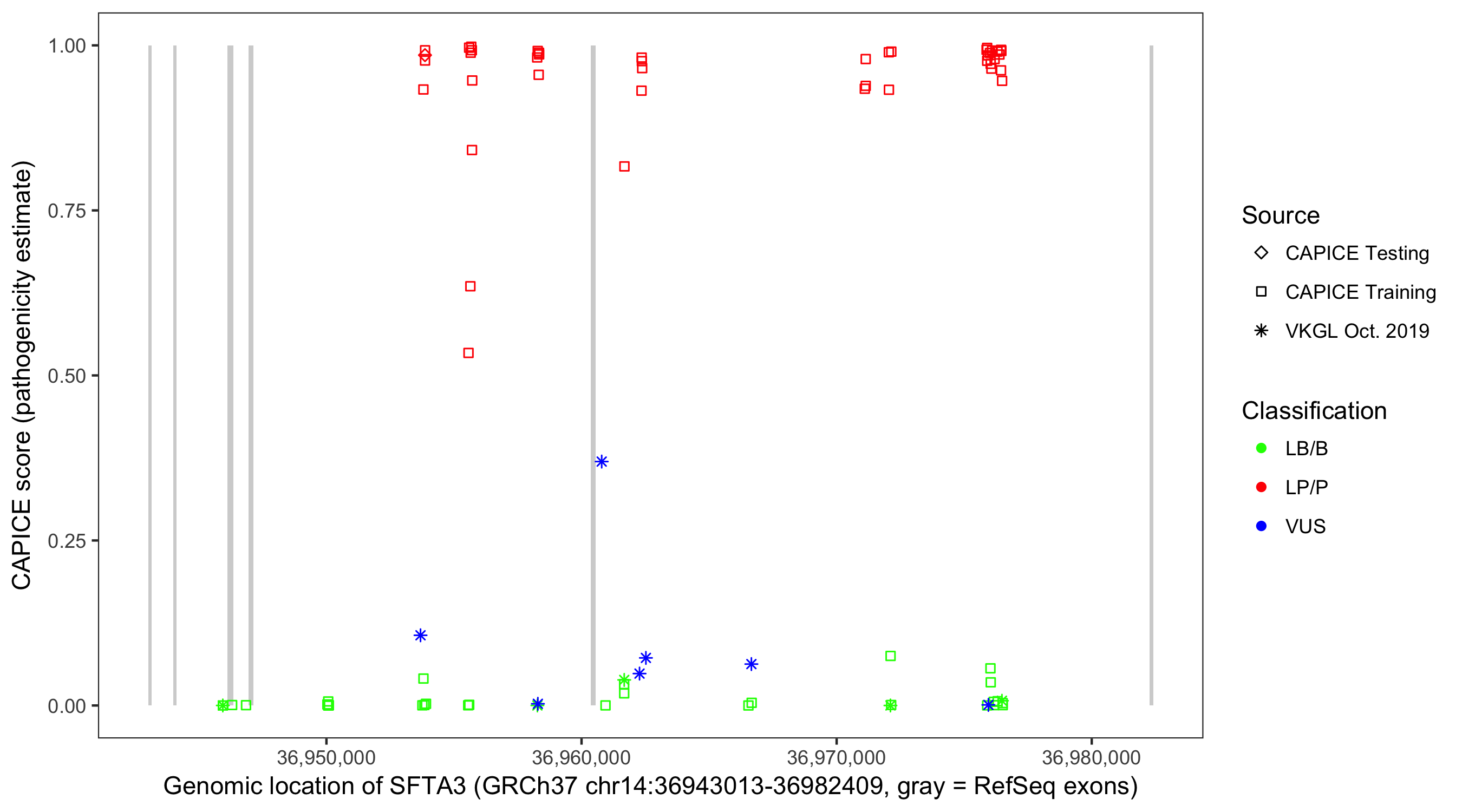 Shown are CAPICE train/test variants plus VKGL Oct 2019.