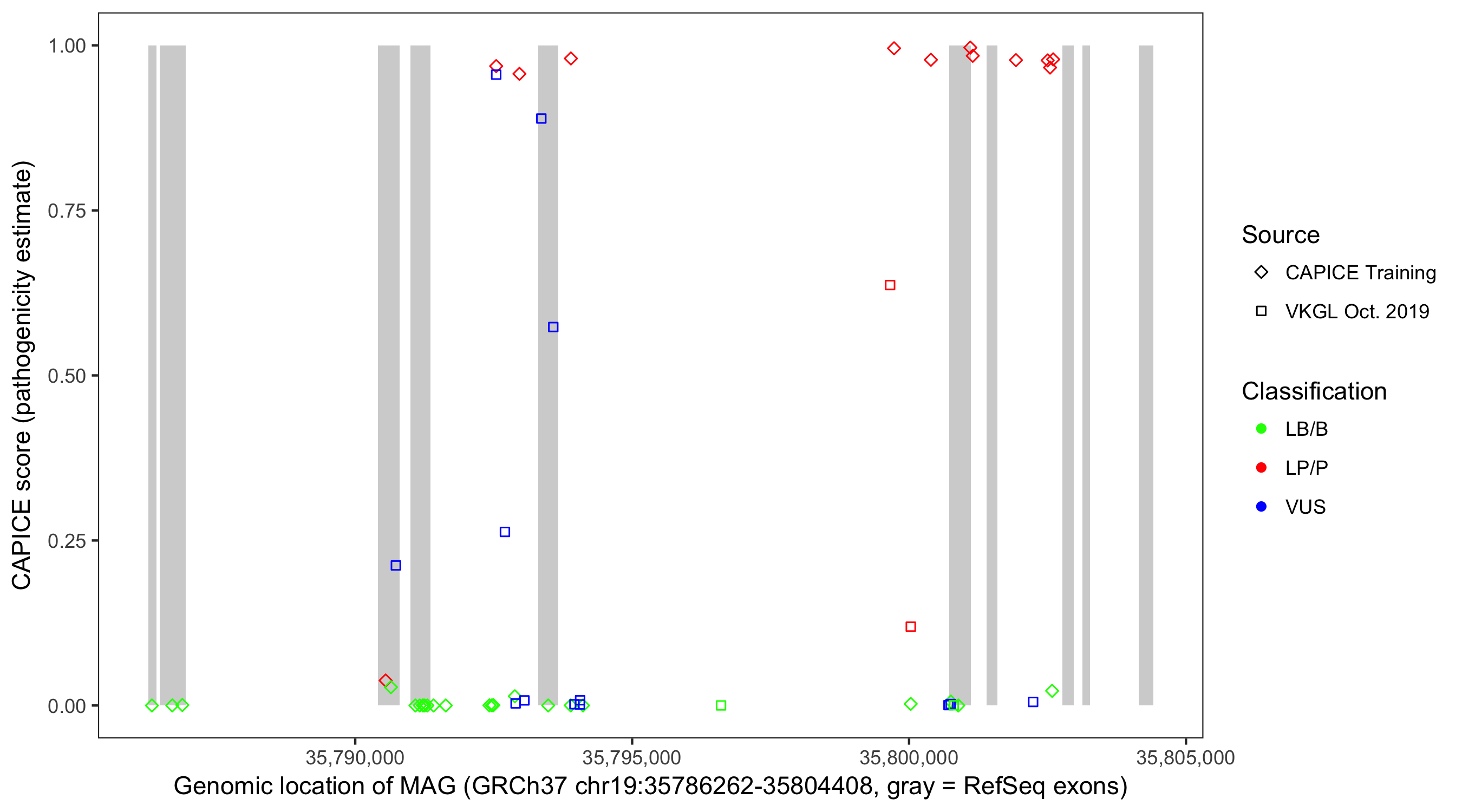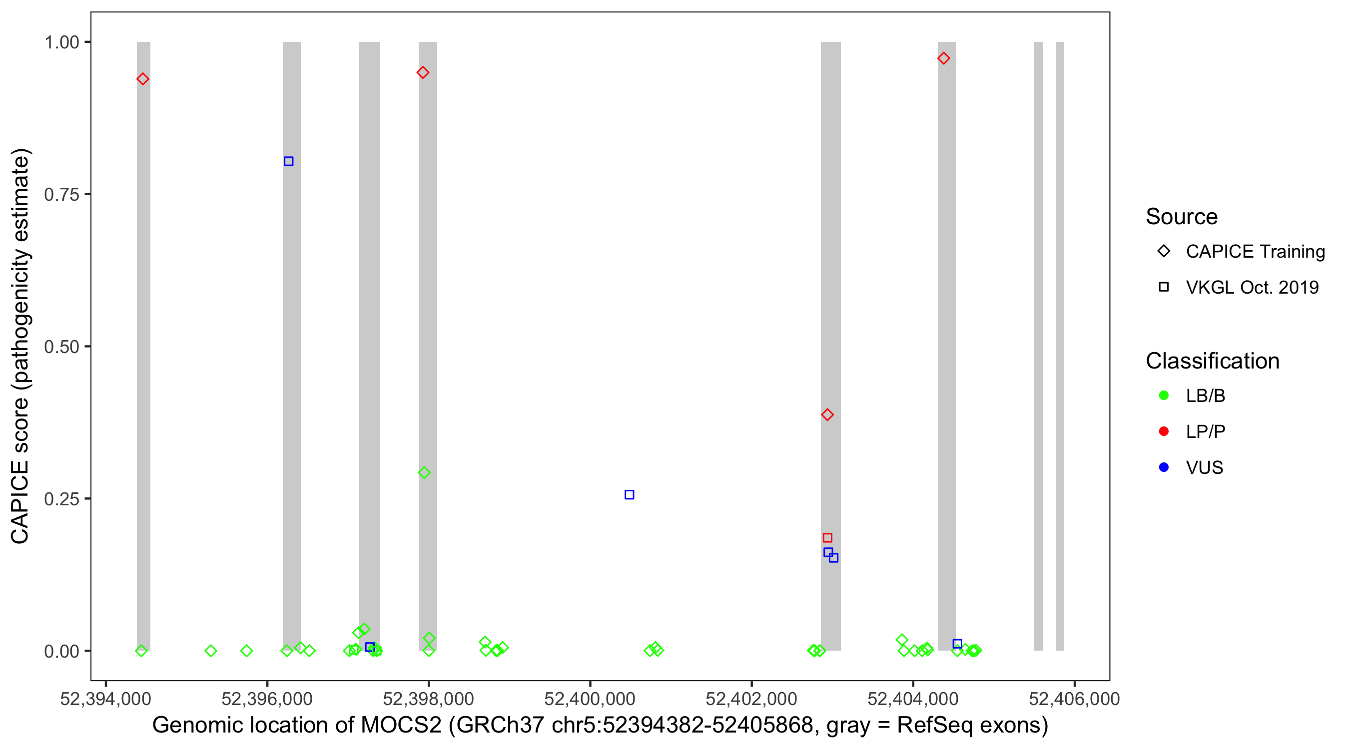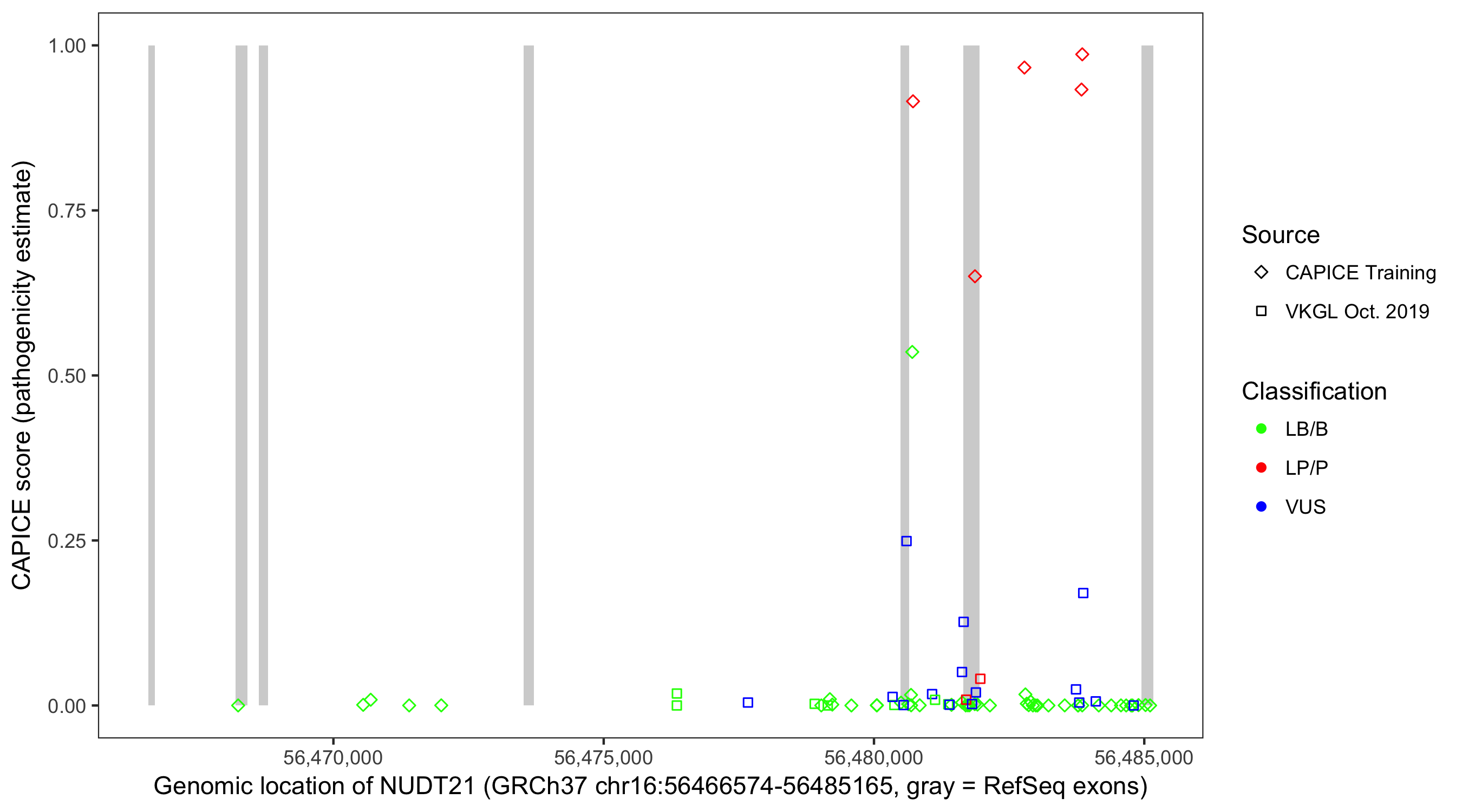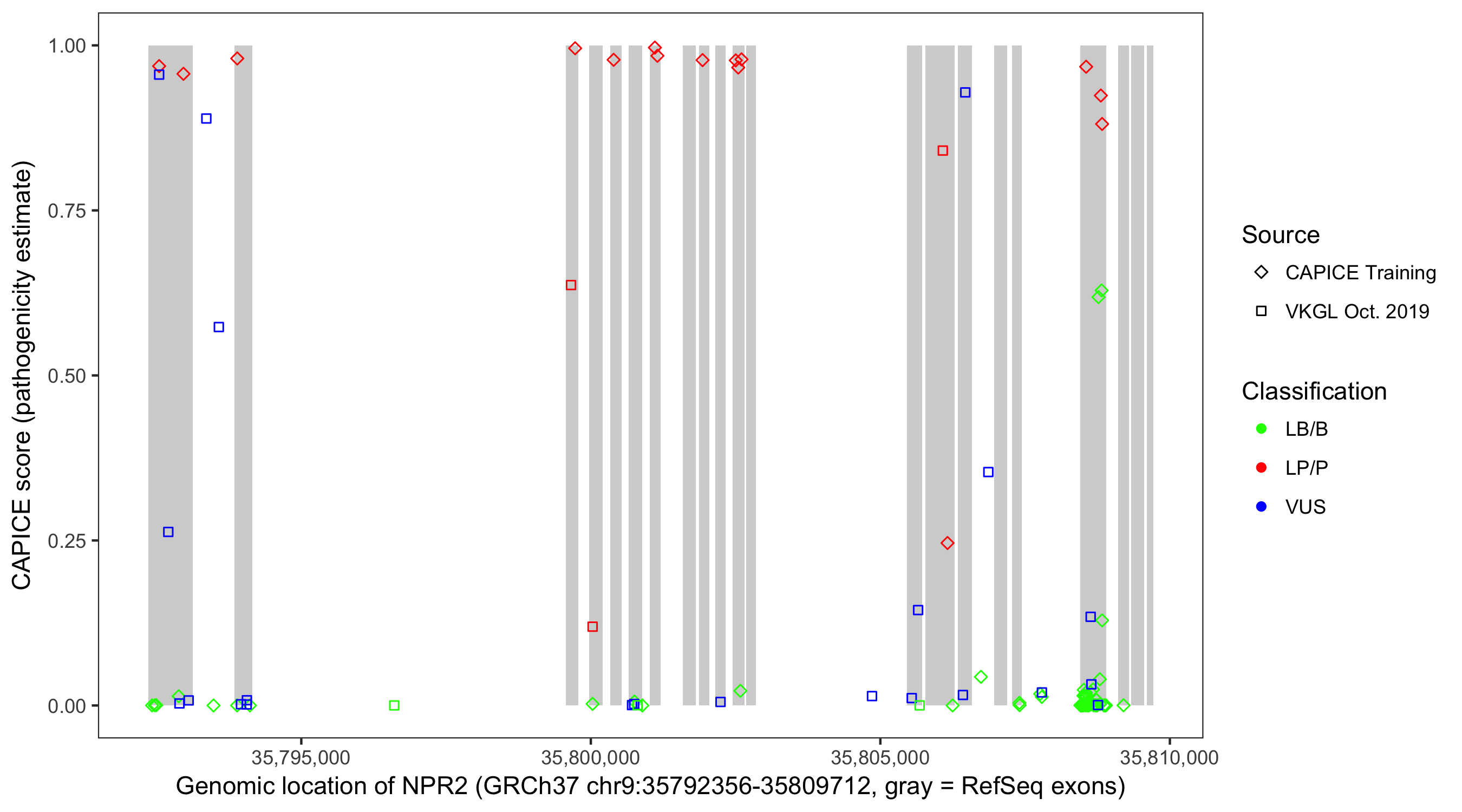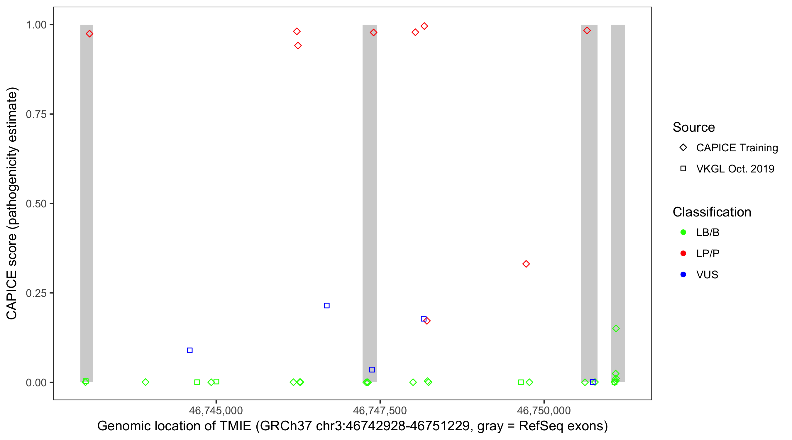 Shown are CAPICE train/test variants plus VKGL Oct 2019.