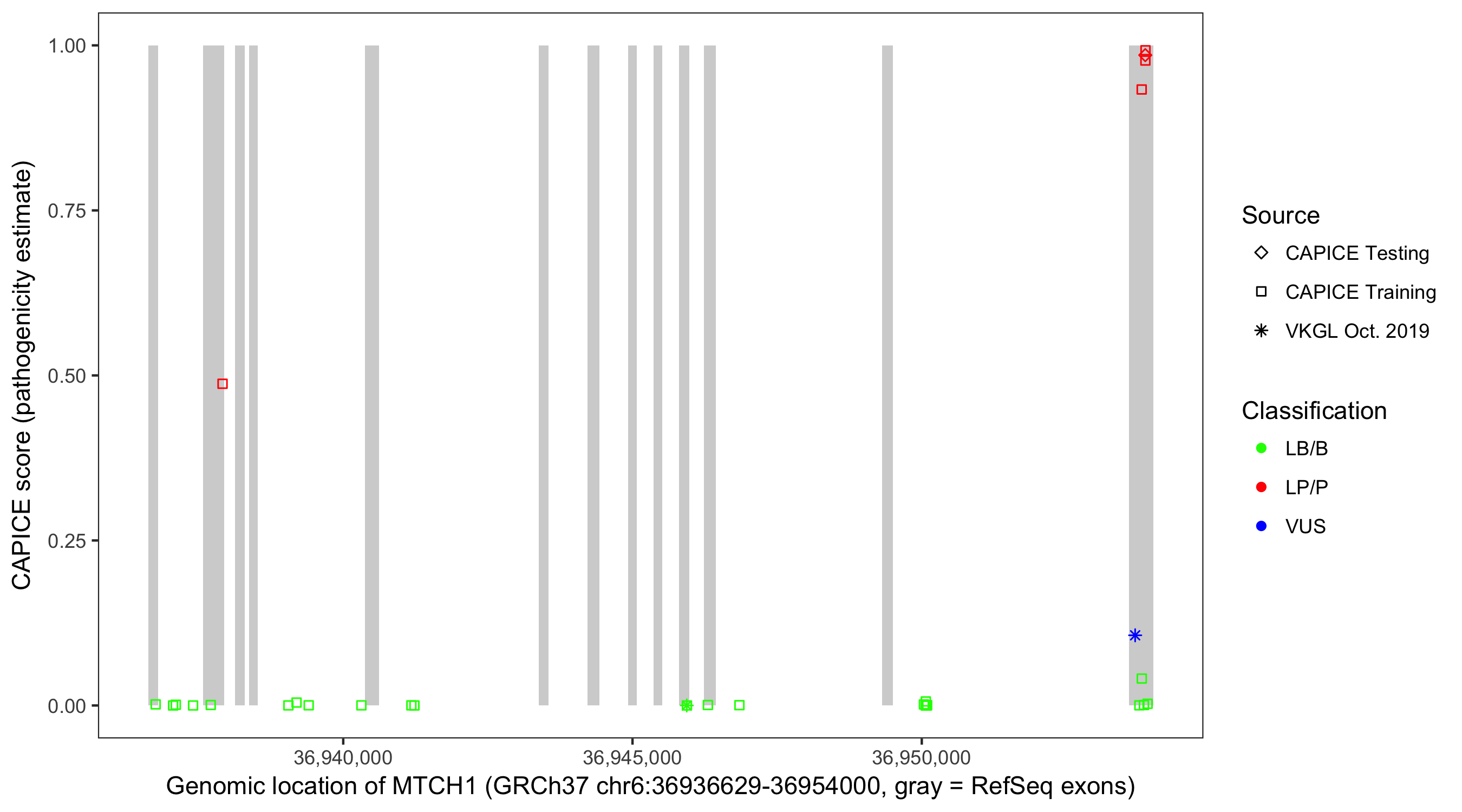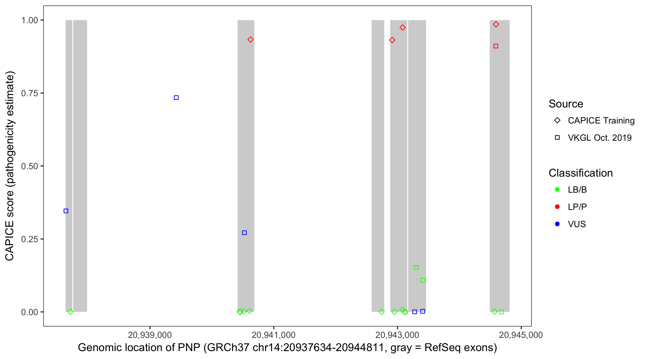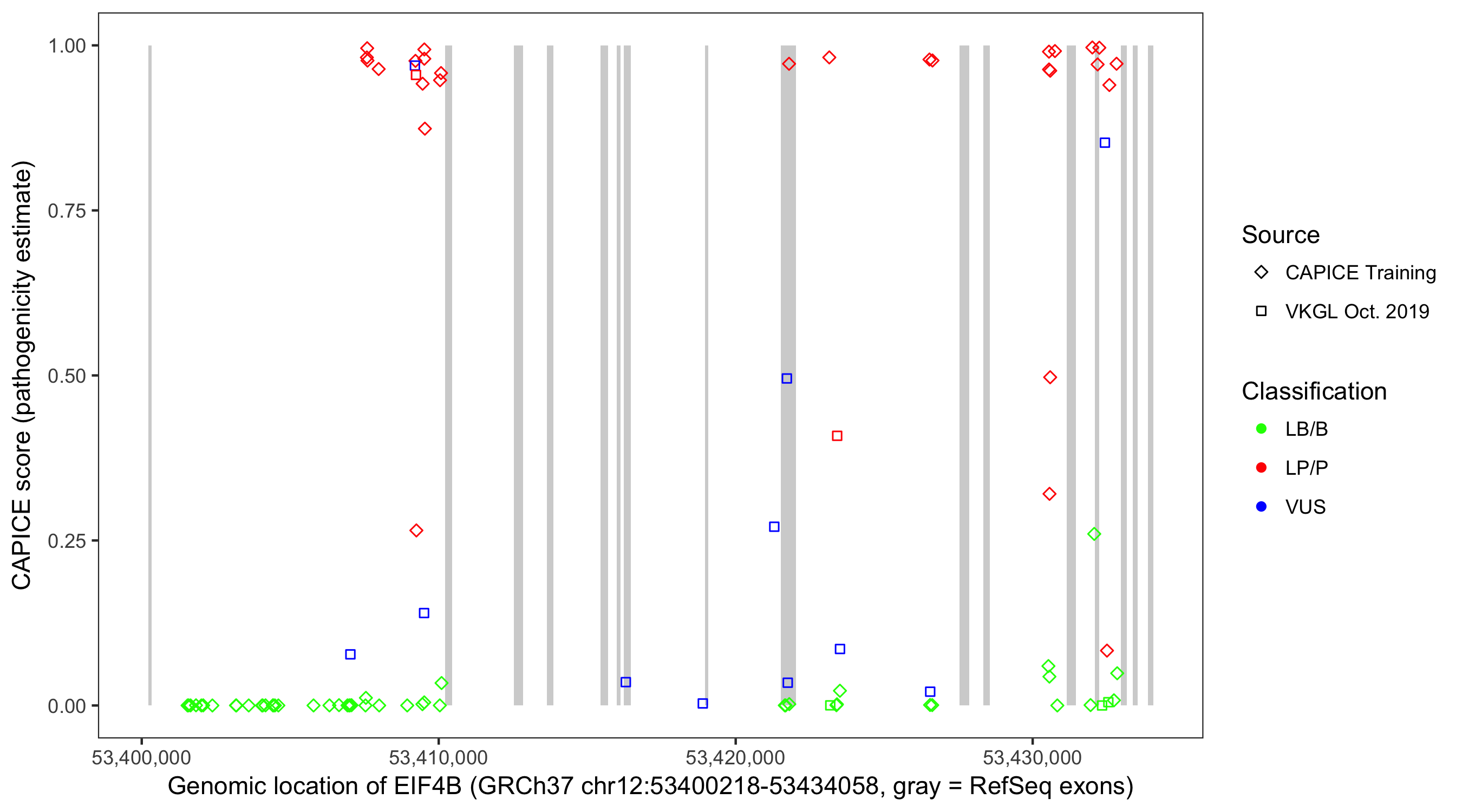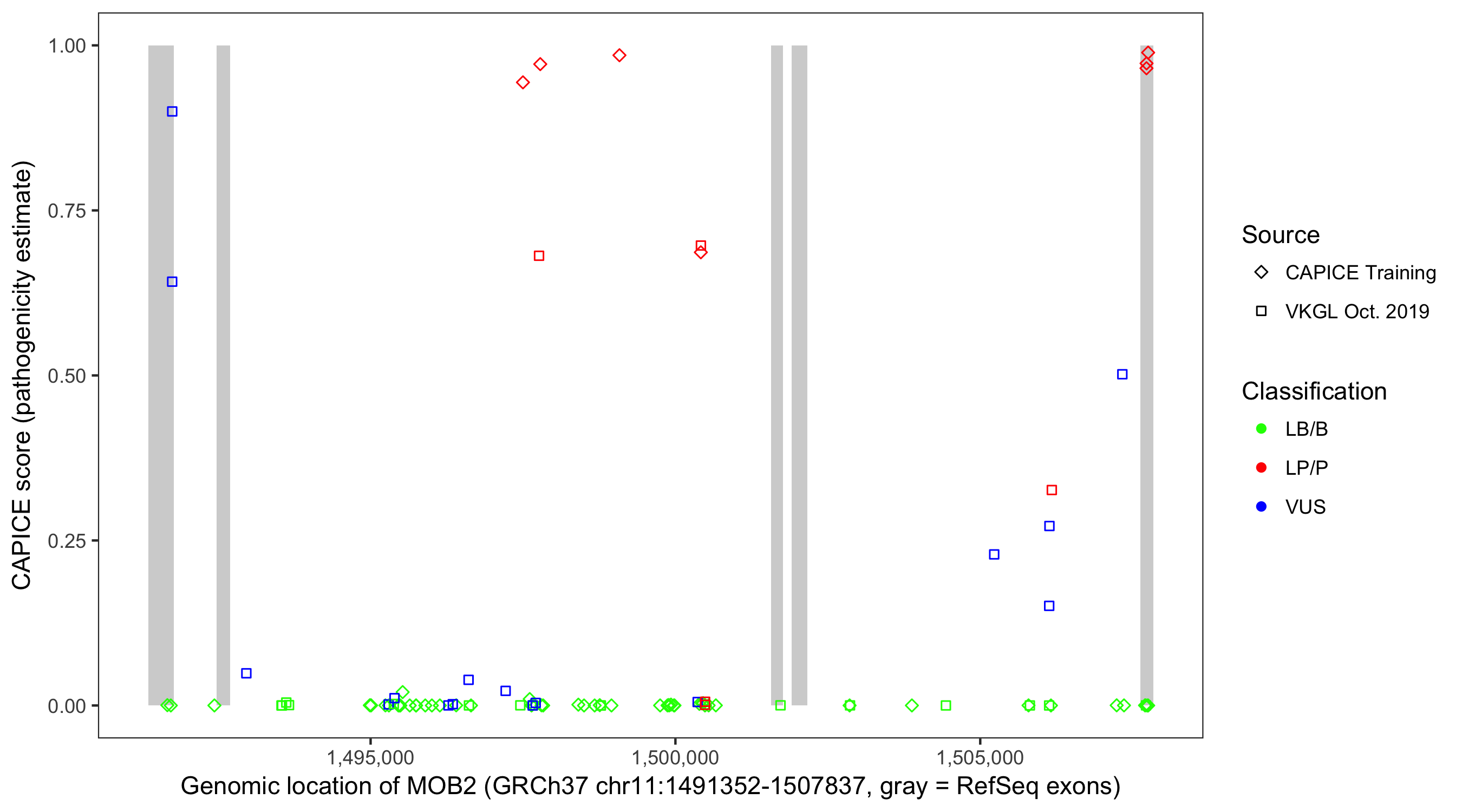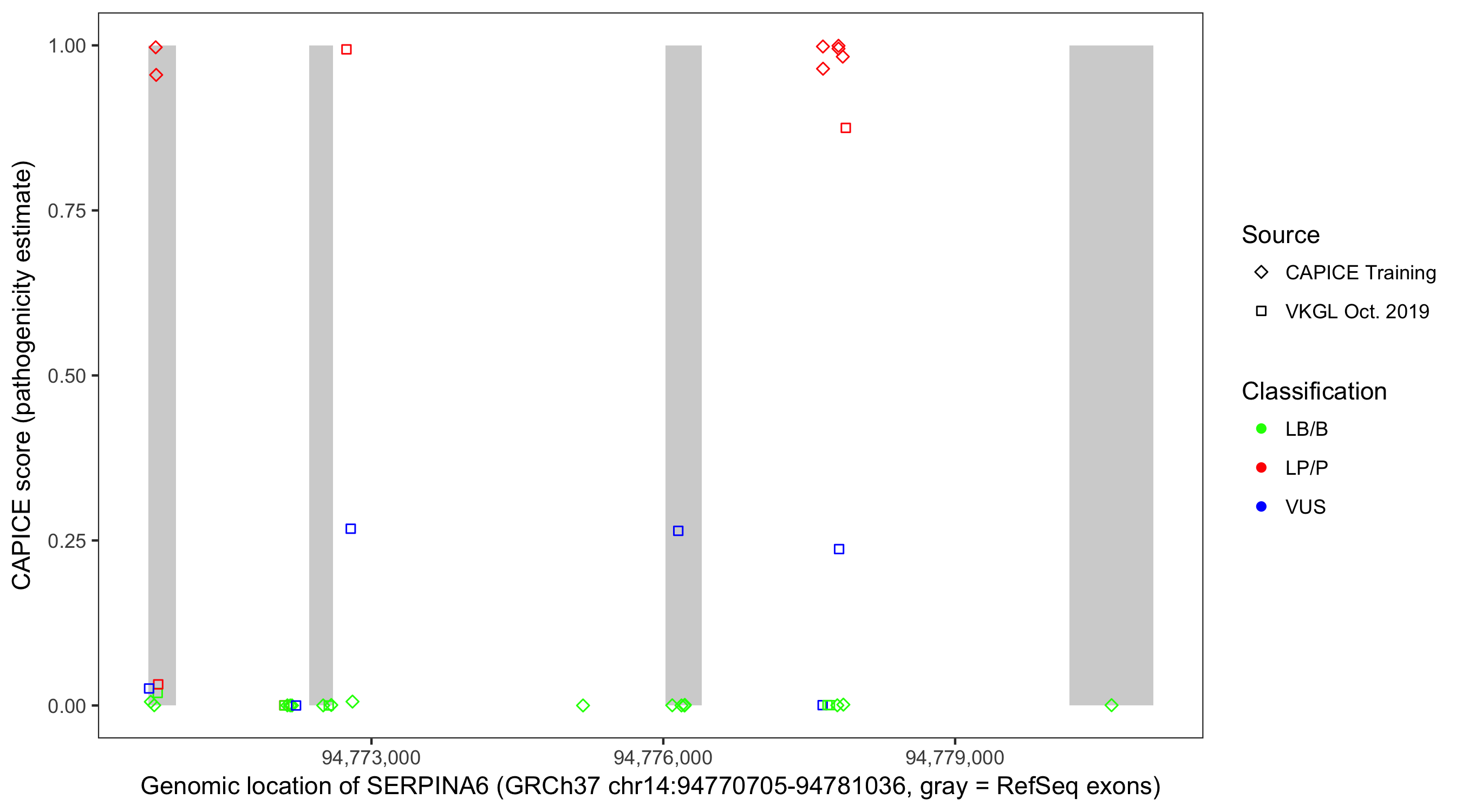 Shown are CAPICE train/test variants plus VKGL Oct 2019.