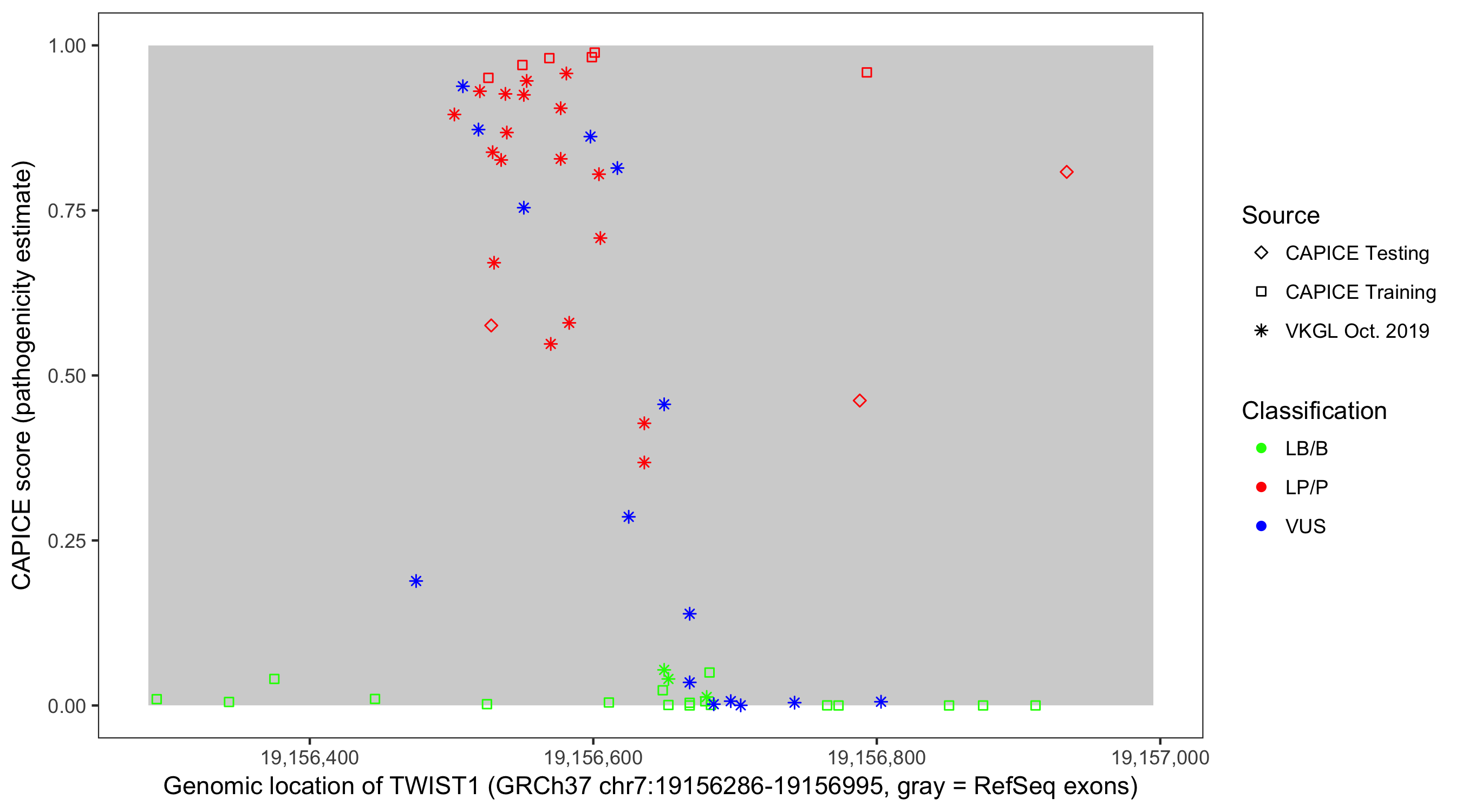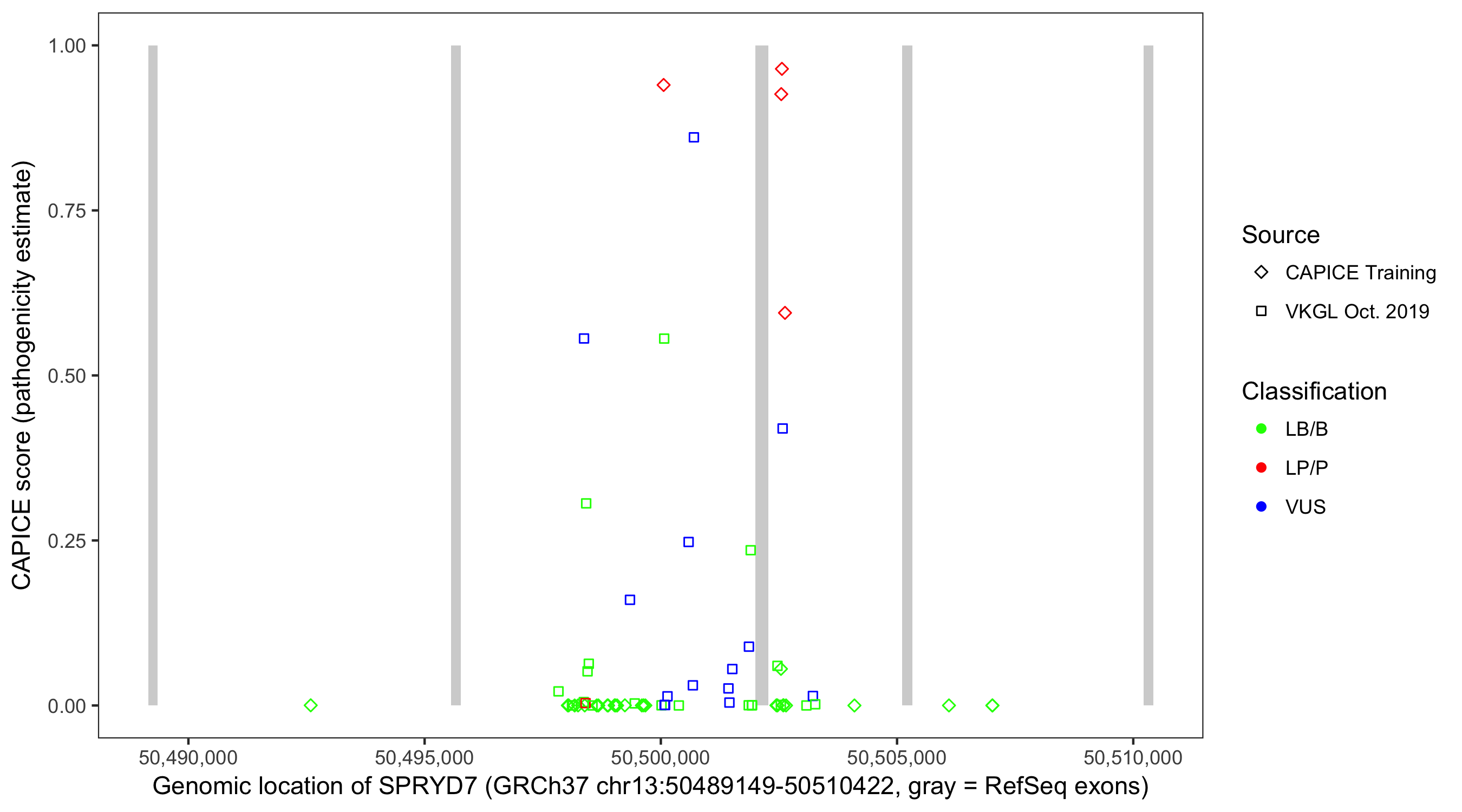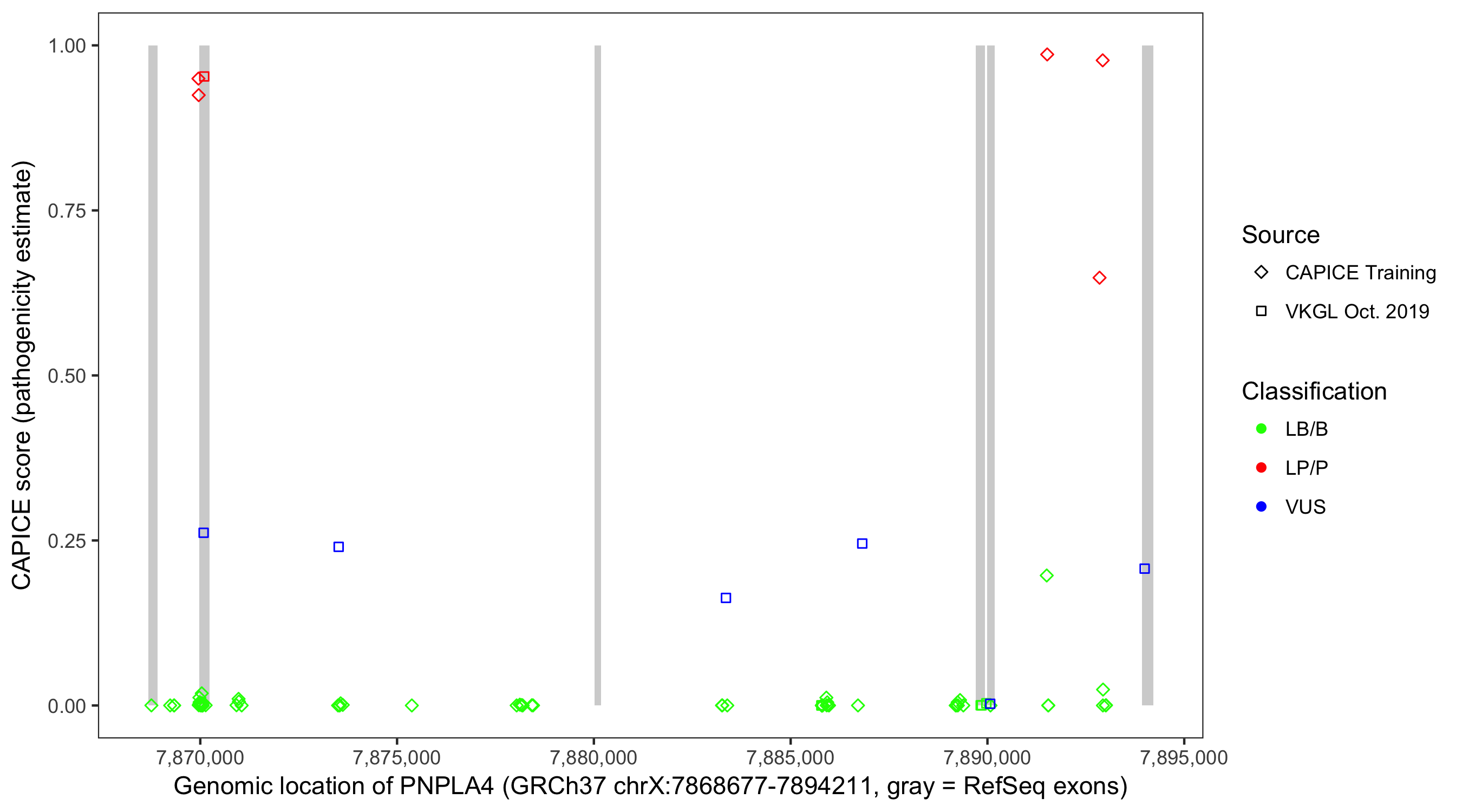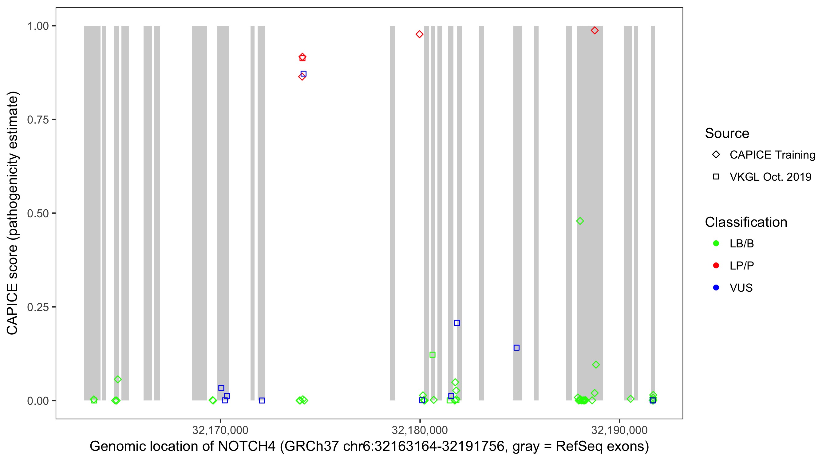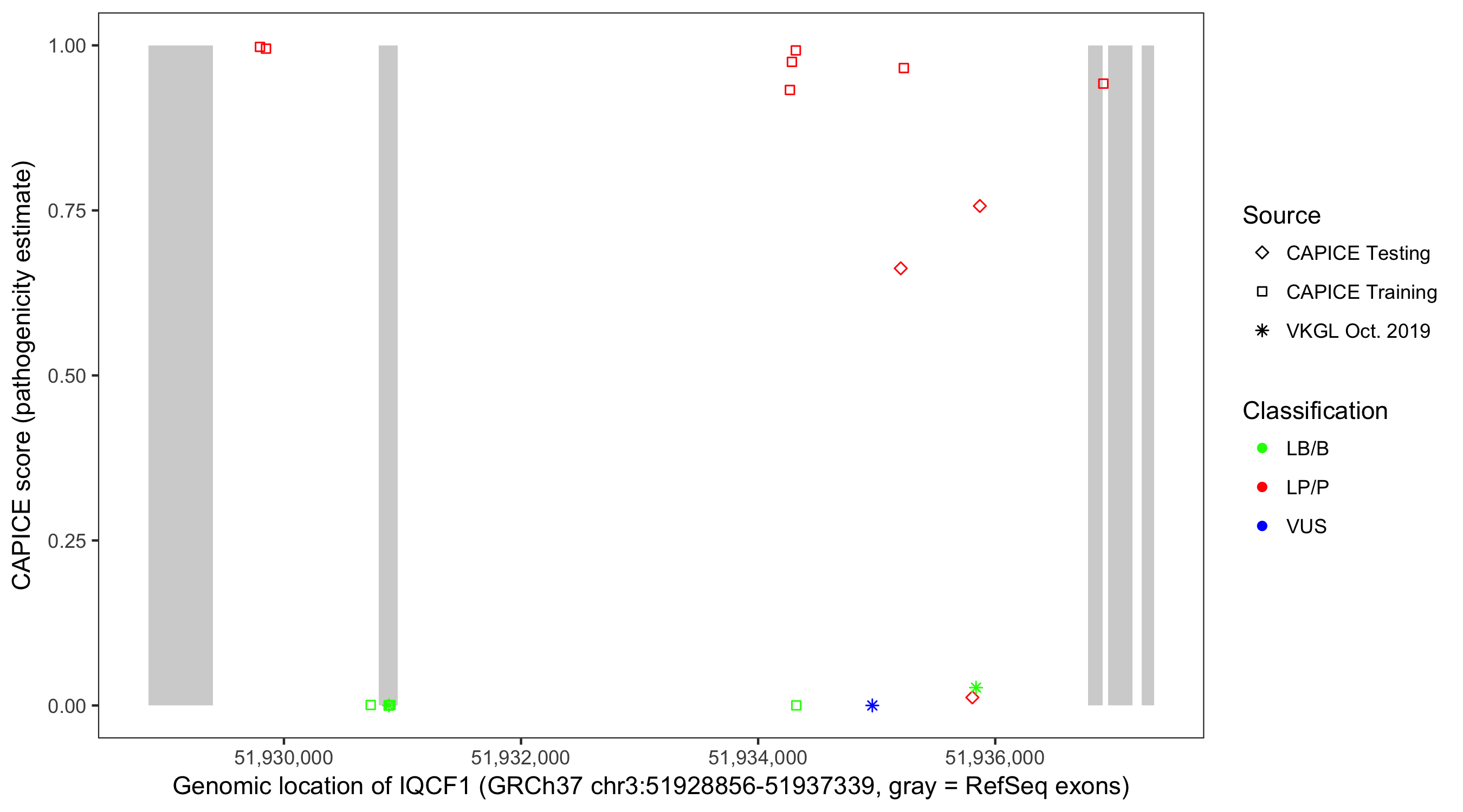 Shown are CAPICE train/test variants plus VKGL Oct 2019.