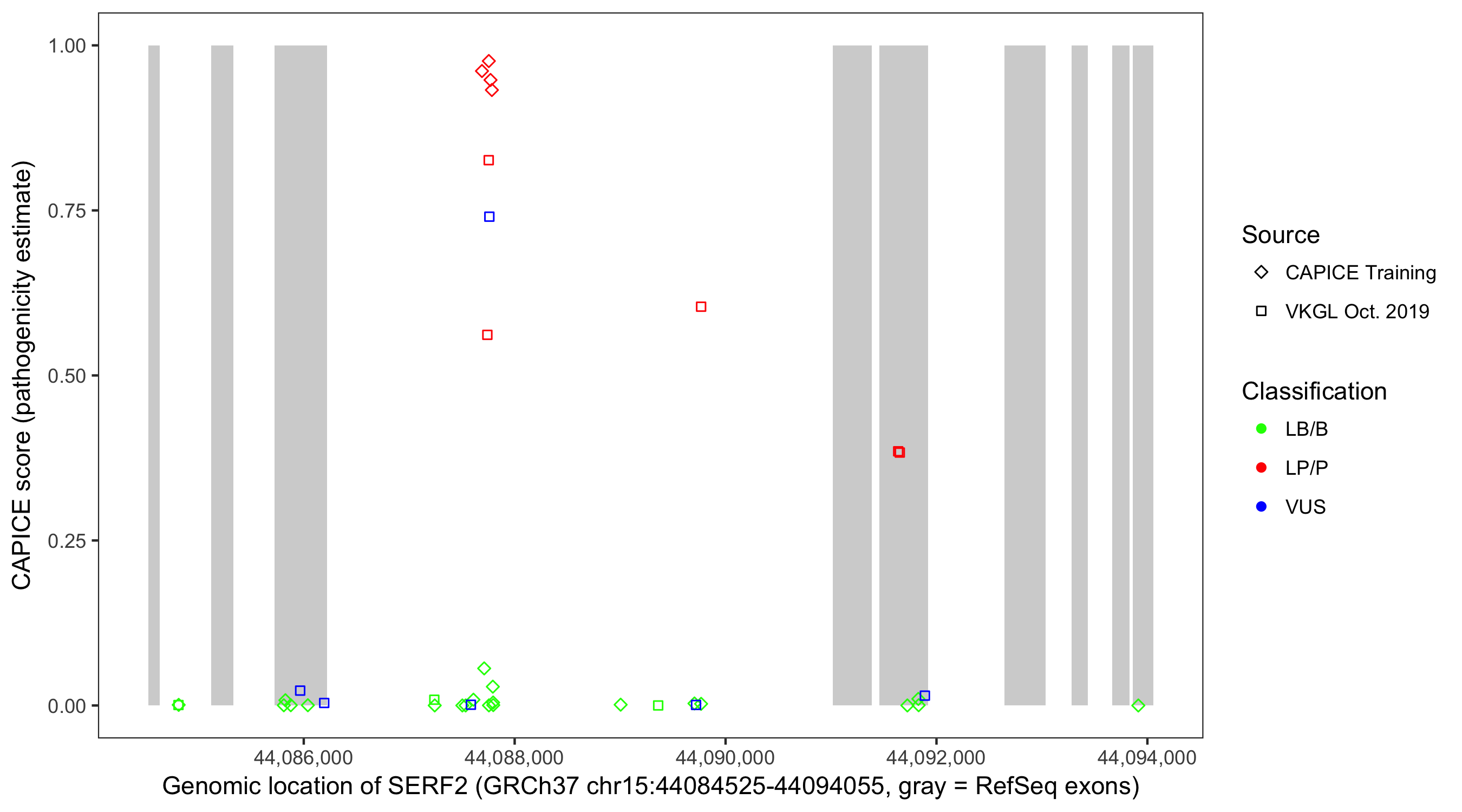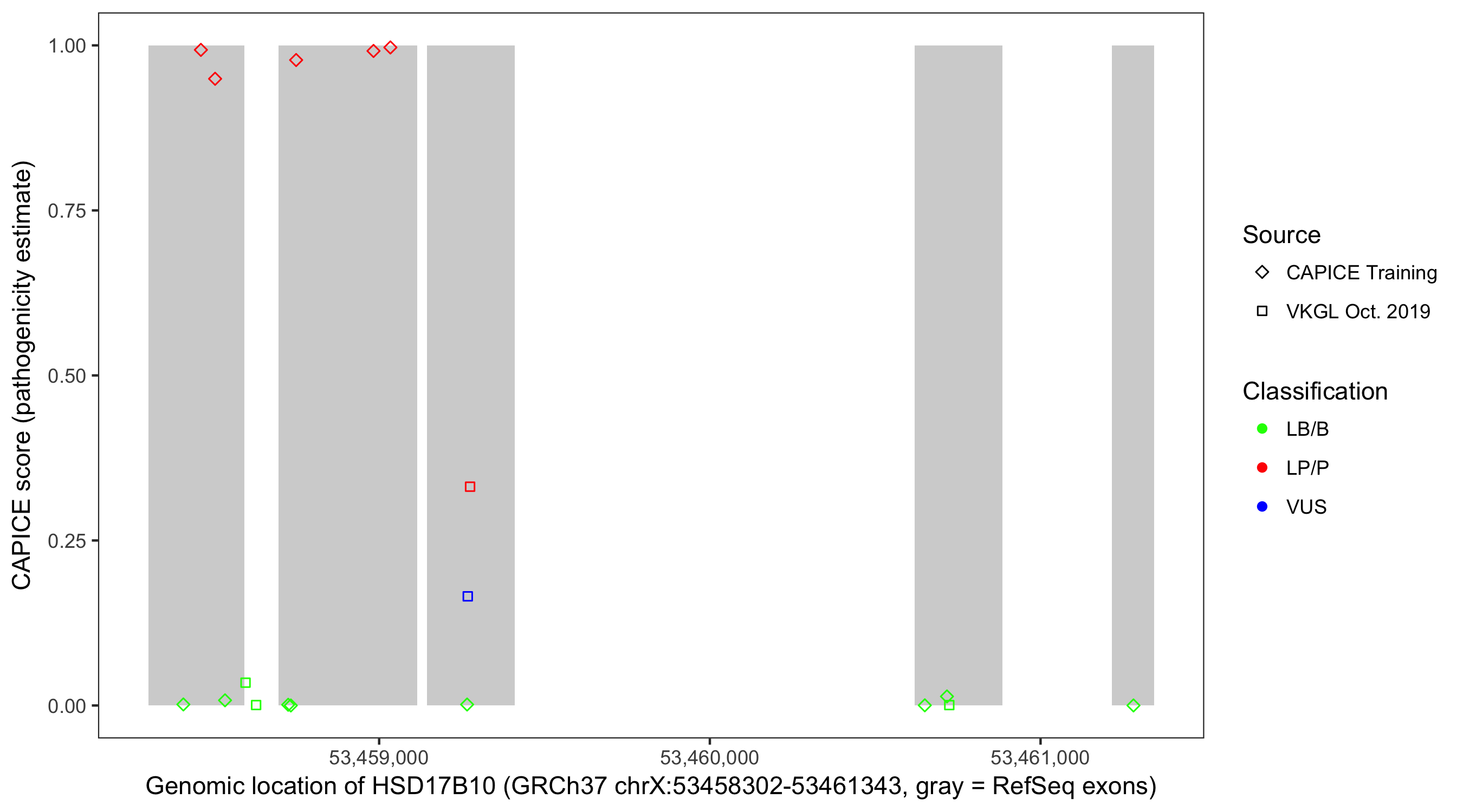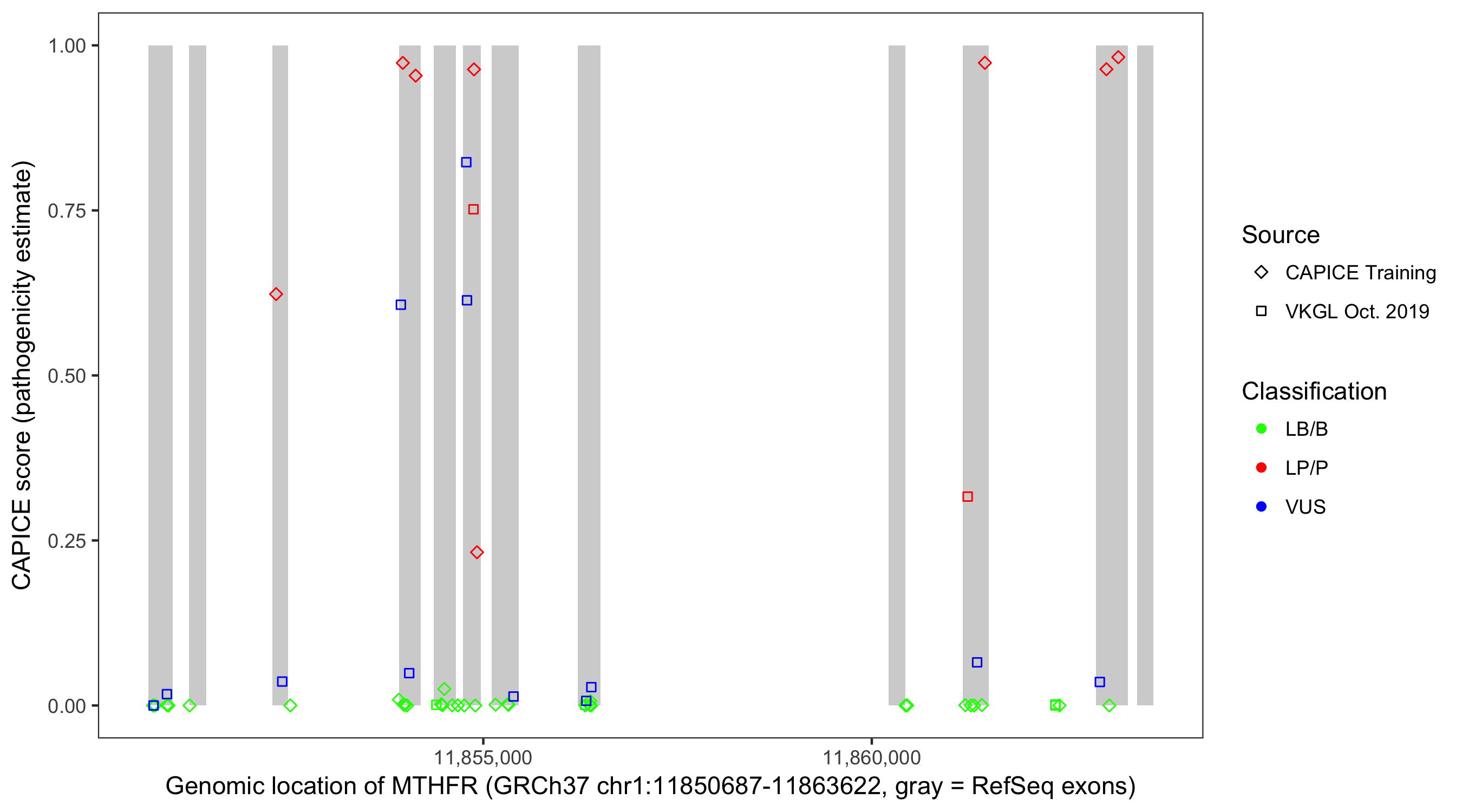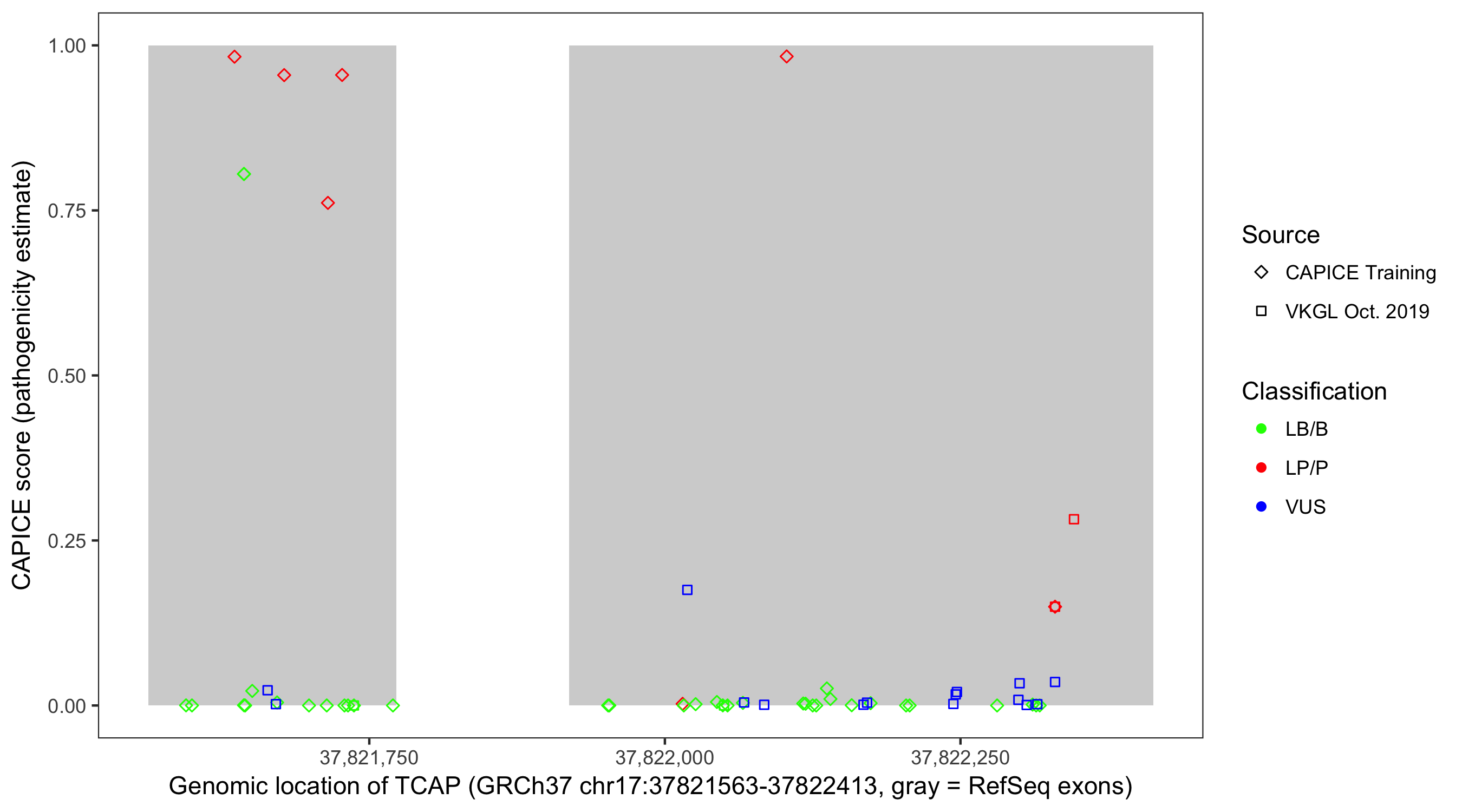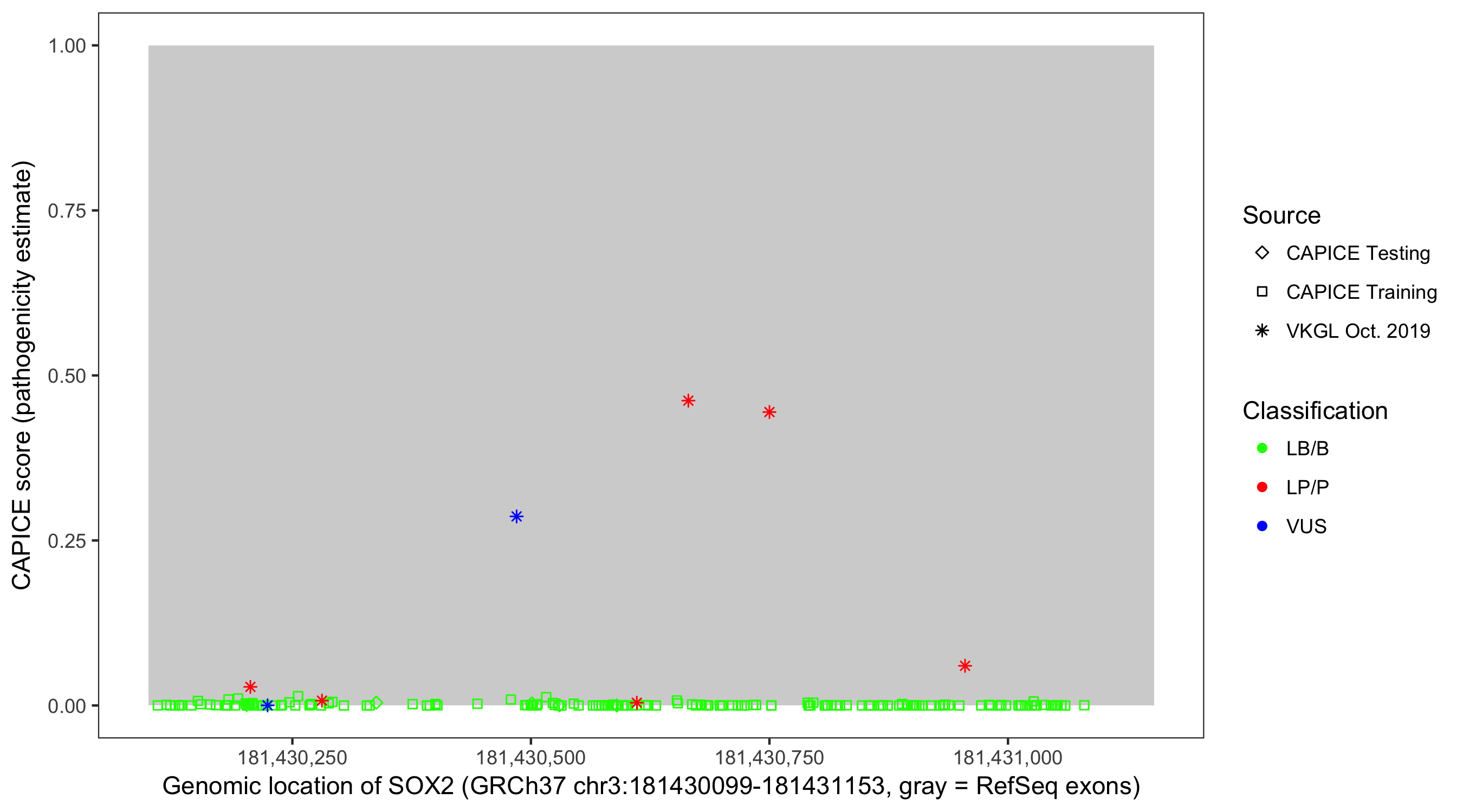 Shown are CAPICE train/test variants plus VKGL Oct 2019.